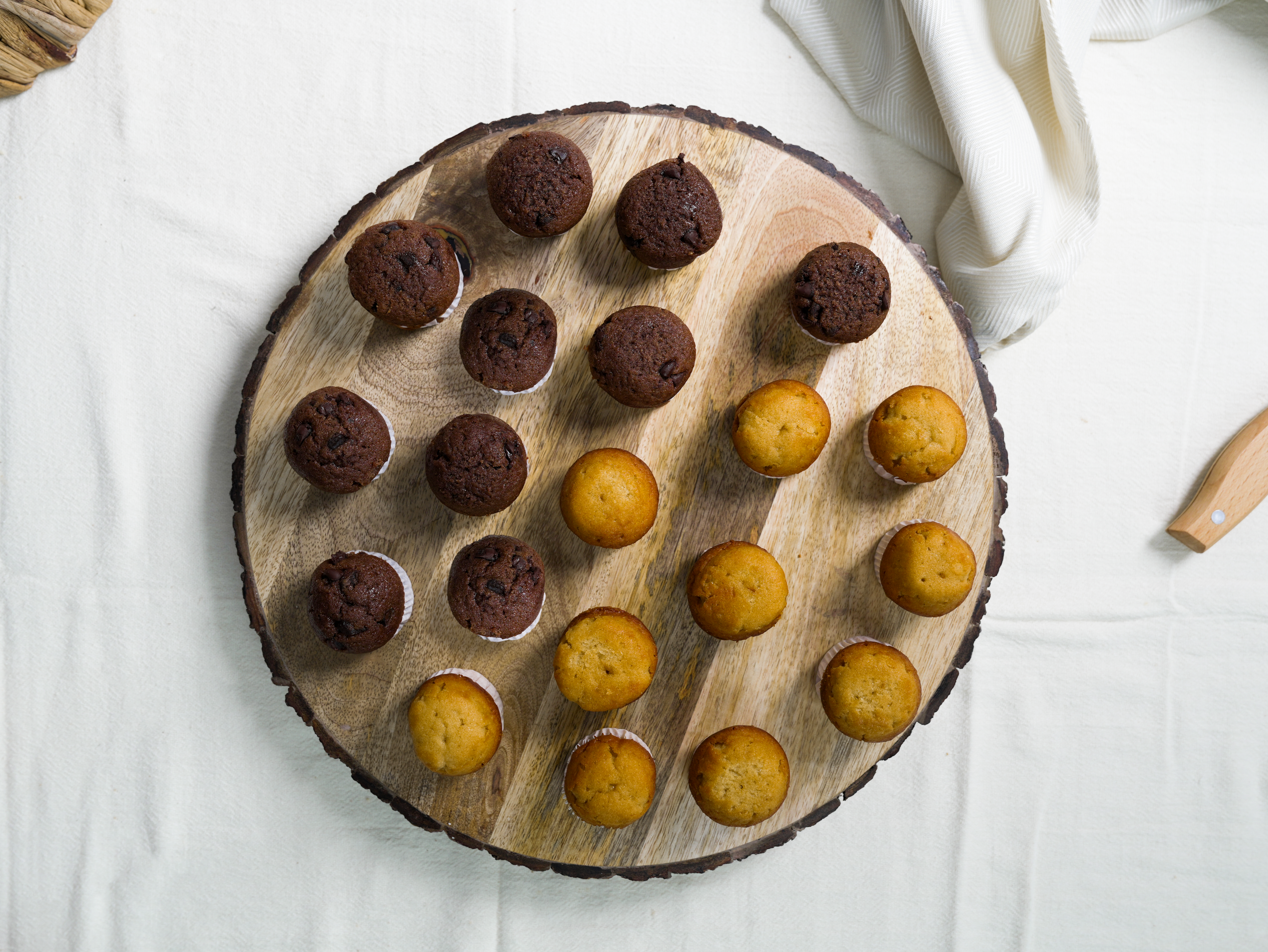 Moist mini muffins baked with cocoa powder,almond powder, natural flour, whole cane sugar, butter, and eggs – rich flavor with