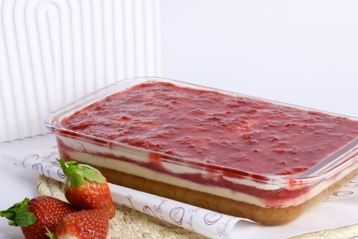 A soft almond-flour vanilla cake layered with silky cream and fresh strawberry slices — light, balanced, and thoughtfully crafted for elegant Ramadan evenings.